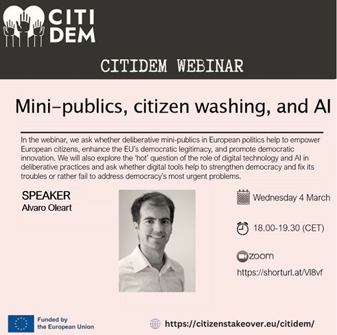 The Citizen Action for Democracy (CitiDem) series is designed to explore and promote innovative ways to strengthen democracy by connecting researchers, policymakers, and citizens. The upcoming webinar, “Mini-publics, Citizen Washing, and AI,” continues this series by examining how deliberative practices—like…