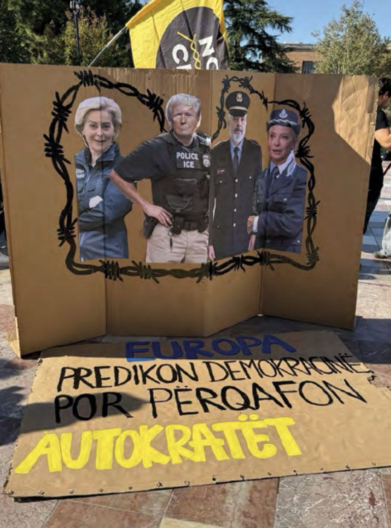 On Saturday, November 1, over 150 people marched through the streets of Tirana, stopping at the Albanian Prime Minister’s office, the Italian Embassy, and the EU Delegation to Albania to denounce the agreement. A large banner depicting Meloni, Rama, Trump, and von der Leyen dressed as prison officials accompanied the protesters, alongside another that denounced: “Europe preaches democracy but embraces autocrats.”